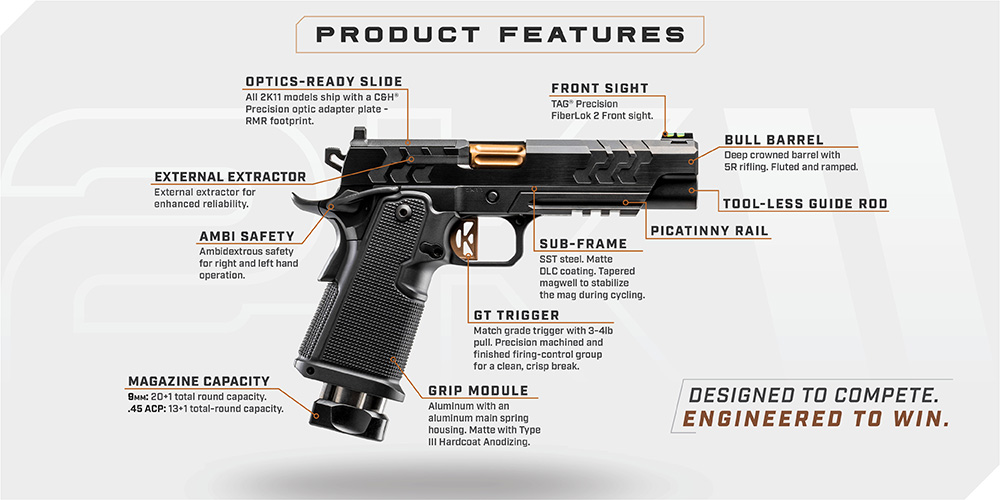 rom hammer to muzzle, the 2K11 has been built around all the features Kimber enthusiasts requested. An enhanced sub-frame shaped for superior magazine fit and control, plus an accessory rail for optional lights and lasers. The 2K11 is also the introduction of the patent-pending tool-less guide rod. The new GT trigger with a 3-4lb pull is precision machined and finished for a clean, crisp break.